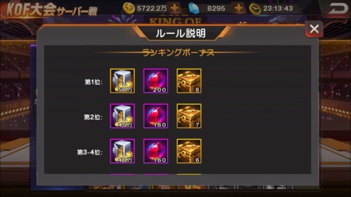 試合に勝てば金の宝箱、負ければ銀の宝箱がもらえますが、この宝箱はサーバー内のKOF大会とは別物で、金の宝箱からサーバ間KOFバッジ(金)、銀の宝箱からサーバ間KOFバッジ(銀)が手に入ります。