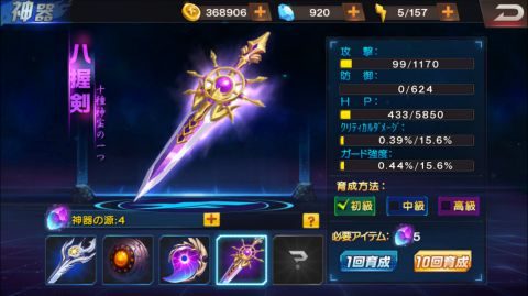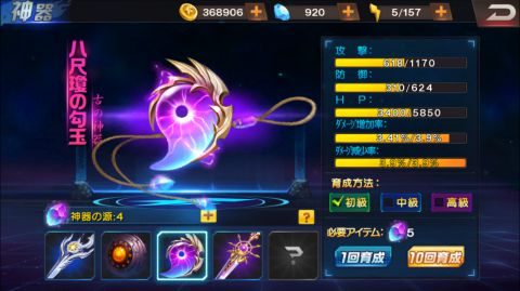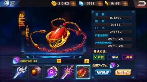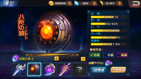 神器を神器の源を使って育成することで、「攻撃」、「防御」、「HP」、「クリティカル率」、「クリティカル減少率」の各能力値がランダムで変動します。