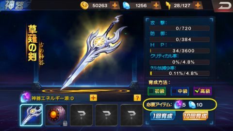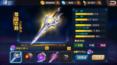 神器の育成方法には、「初級」、「中級」、「高級」の3段階があり、効果が違います。
