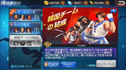 「キングオブファイターズ’98 アルティメットマッチ オンライン」(KOF’98 UM OL)の「格闘家伝説」のストーリー「韓国チームの結成」のスキルツリーをまとめています。