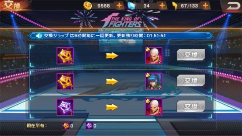 集めたKOFバッジはKOF画面の交換からSR「オロチ社」やSR「レオナ」の破片と交換することが出来ます。
