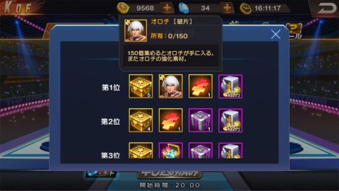 KOF大会ではランキングやKOFバッジでURの「オロチ」、SRの「オロチ社」、SRの「レオナ」の破片をもらうことができます。