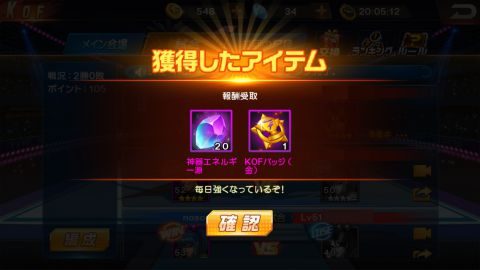 宝箱からは「KOFバッジ(金)」、「KOFバッジ(銀)」と「神器エネルギー源」、「覚醒石」、「コイン」などが手に入ります。