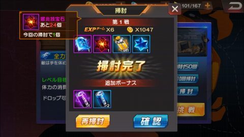 掃討の結果画面で能力UPなどに使うアイテムの残りが表示されるのはありがたいです。
