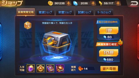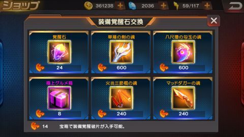 「装備覚醒宝箱」はガチャのように運だのみですが、「破片交換」では装備宝箱を開けたときにもらえる「覚醒破片」と覚醒石やキャラクター専用武器の覚醒素材を交換できます。