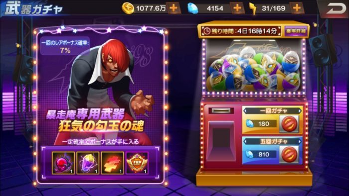前回開催された「クーラ」と「K’」の限定武器ガチャの内容はこちら。