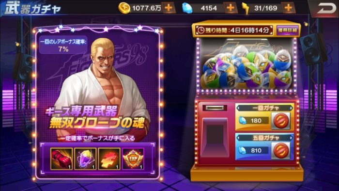 ギースの武器ガチャは1回180ダイヤ、5回で810ダイヤ、大当たりの「無双グローブの魂」は出現率1%となります。
