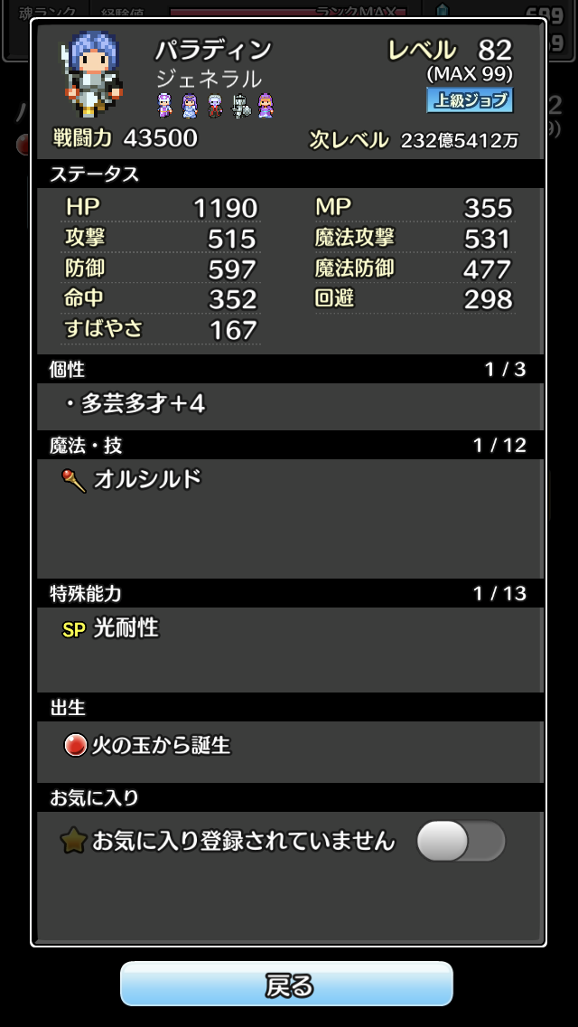 | 80:パラディン | ジェネラル (火の玉) | 多芸多才+4 | 商人、亡霊、僧侶、騎士、占い師 |