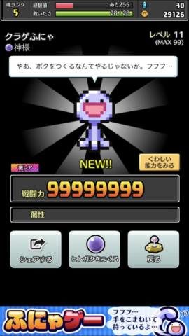 例えば「神様」の名前を入力すると戦闘力99999999の激レアヒトガタ「クラゲふにゃ」が出現します。