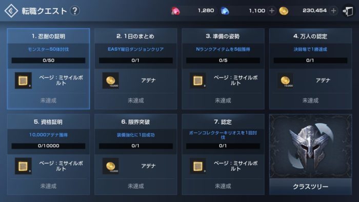 転職クエストは全部で7つあり、すべてを順番に達成することで転職が可能となります。(一部例外があります。)