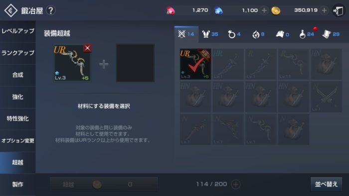 超越にはベースと素材にURランクの同じ装備が必要となります。