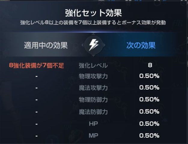 強化レベル+8以上の装備を7つ以上装備することで強化セットのボーナスが発動します。