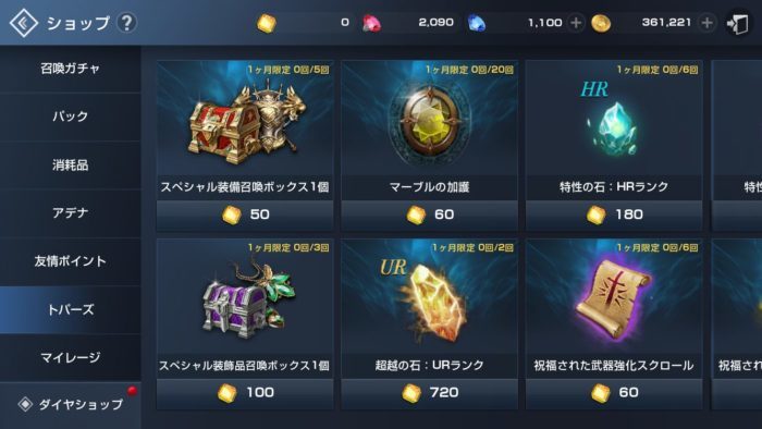 トパーズもマイレージと同様にショップで貴重なアイテムと交換することができます。