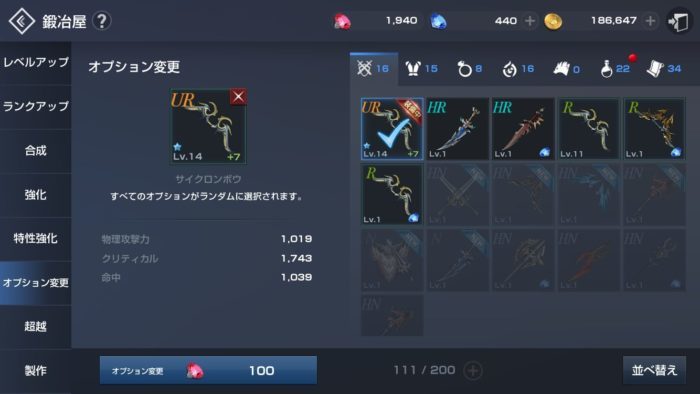 オプション変更を行うことで装備に設定されるオプションをランダムで再設定することができます。