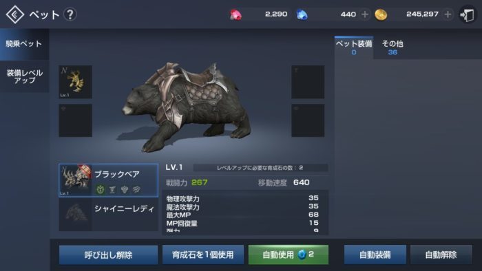 ブラックベア魂石を手に入れるとペットのチュートリアルがあって、ペット機能が解放され「ブラックベア」に乗れるようになります。