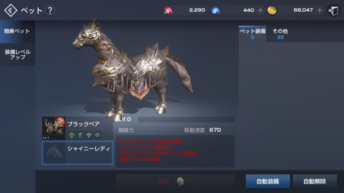 ペットは種類によって移動速度が異なり、レベル80で解放される「シャイニーレディ」はブラックベアより移動速度が速いです。