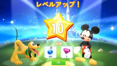 プルートとミッキーの可愛い演出とともに王国がレベルアップし、ジェムやマジックといった報酬が受け取れます。