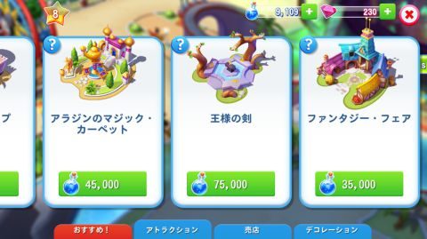 「アラジンのマジック・カーペット」は45,000マジック、「王様の剣」は75,000マジックで建設することができます。