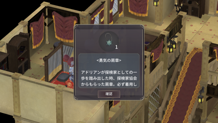 | 5 | 門に近づくとイベントが発生。 ヨハネスに連れられて領主の自宅に入る。 階段を上り2階にいるアドリアンに近づくとイベント発生。 アドリアンから勇気の肩章をもらう。(必ず先制、魔力シールド効果UP)