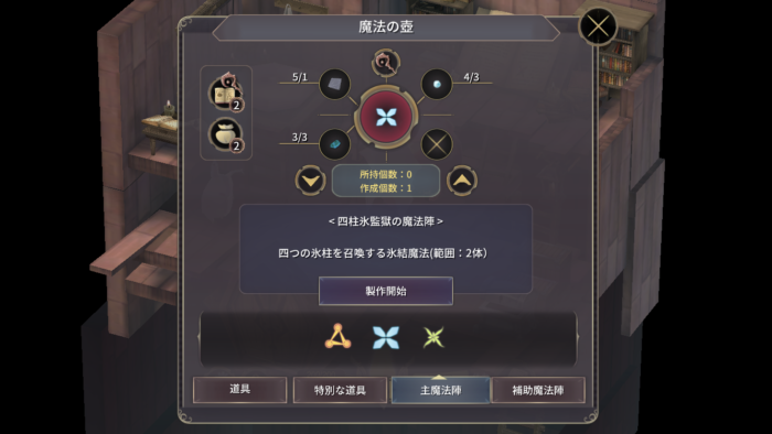 | 2 | 人形の家の魔法の壺で四柱氷監獄の魔法陣を製作する。   必要な素材と入手方法は以下の通り。 - 魔法石版×1(霧の洞窟の霧ゴーレムがドロップ)