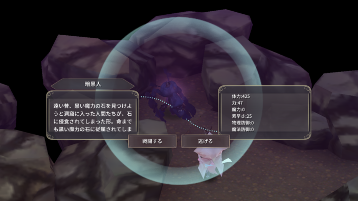 | 2 | 黒い魔力の石を求めて霧の森東の東にある黒石窟に移動する。 黒い魔力の石はフィールド上の素材と暗黒人を倒して入手する。 暗黒人は電撃魔法で気絶させると楽に倒せる。  黒石窟の最奥にいる暗黒巨人をこの段階で倒すのは厳しいため無視。 |
