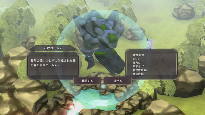 | 1 | ストーリー進行上で必ず達成する課題。 コケゴーレムは霧の森東の南の泉の前にいる。 イノシシ人形を手に入れた後で、素早さを上げて魔法攻撃を中心にすると楽に戦える。
