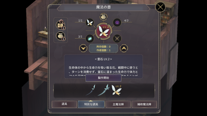 | 4 | 人形の家に戻り、魔法の壺で霊石LV.2を製作する。   霊石LV.2を手に入れると生命力を200まで溜めれるようになり、新たにララ、レイチェル、ガウリを起こすことができるようになり、これまでに登場した人形のレベルも上げれるようになる。 ここで人形を起こしてレベルを上げておくと、以降の攻略がぐっと楽になるのでおすすめ。 また、戦闘中に霊石を使うと溜めた生命力で体力とマナを回復できる。 小さな霊石を手に入れる。 |