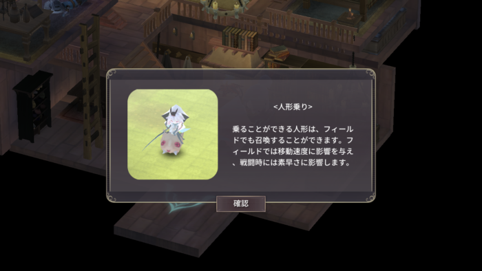 | 1 | 人形の家から東の霧の森東に移動する。 霧の森東の北東のおばあちゃんの家に入るとイベントが発生。  おばあちゃんからイノシシの人形をもらう。 以降は人形の家の地下でイノシシ人形を起こすことができる。(生命力:50) イノシシの人形はフィールドでも乗ることができ、フィールドでは移動速度、戦闘中では素早さに影響する。  霊石を大きくするため黒い魔力の石×3を探すことになる。 黒い魔石は霧の森東の南にある泉の湧き水で浄化しないと使うことができない。 |