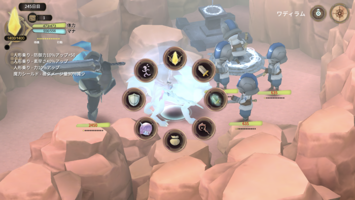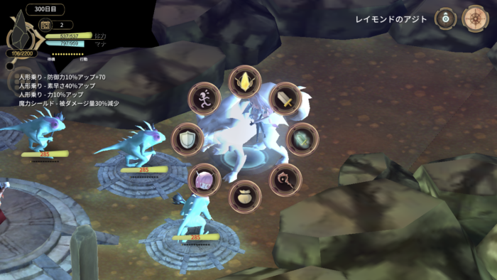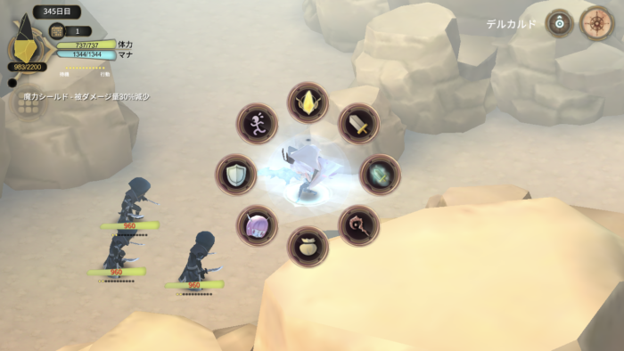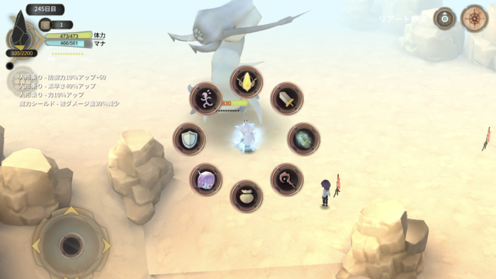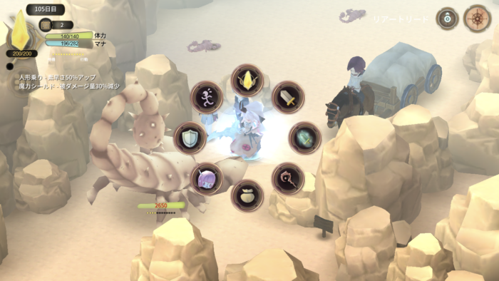 | 2 | リアート村の南からリアート砂漠に移動する。 リアート馬車引きの近くにある穴の付近で「フェネックのガス弾」を使う。 砂漠の主との戦闘に勝利する。(砂漠の主のトゲ×1) 砂漠の主はHPが9830とこれまでの敵に比べて格段に固い。 |