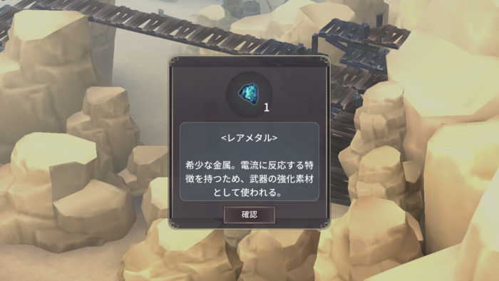 大型コウモリ×3との戦闘に勝利すると、レアメタルがもらえる。 レアメタルは名剣シューベターの強化素材。(強化には目標「シューベト東の工房のザルエル」もクリアする必要あり。) ![]() ![]()