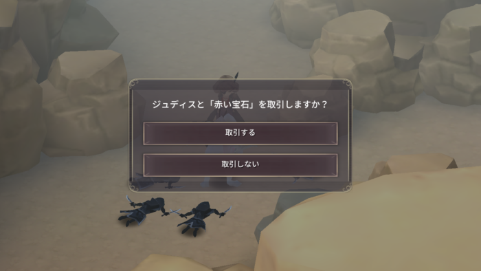 | 1 | リアート砂漠の南西からリアート砂漠南部に移動し、巨大砂漠サソリ×1、砂漠サソリ×4との戦闘に勝利する。 |