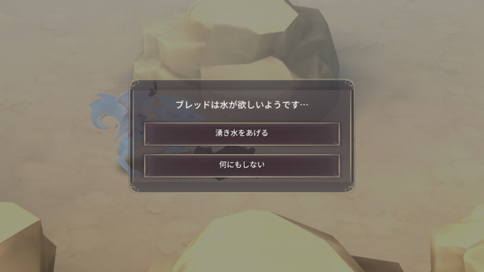 | 2 | リアート砂漠の南西からリアート砂漠南部に移動し、倒れているブレッドに湧き水をあげる。 ブレッドから10000ゴールドをもらう。 |
