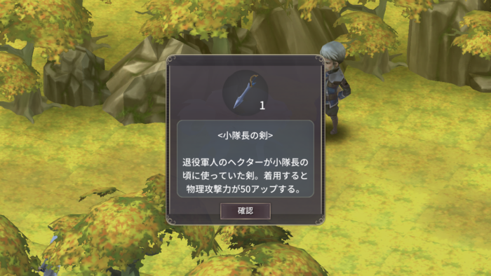| 1 | シューベロードにいる退役軍人ヘクターに話しかけると小隊長の剣がもらえる。 小隊長の剣は物理攻撃力+50の効果。 |