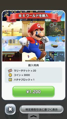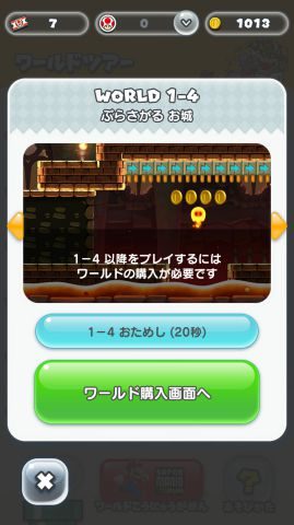 ダウンロードは無料ですが、事前に1200円ということが発表されてたので、どこから有料になるんだろうと思いながらプレイしてましたが、ワールドツアーの1-3までクリアしたところで、1-4以降は有料(1200円)となりました。