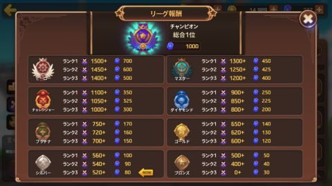 リーグポイントによりランクが変動し、リーグ報酬の画面が閾値を確認できます。