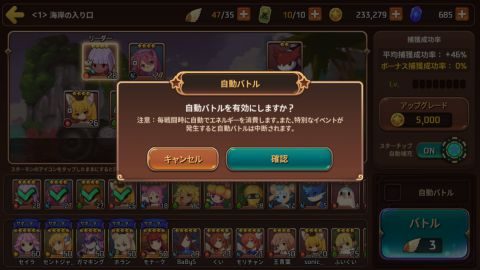 「自動バトル」は一度クリアしたステージで使うことが出来、ステージクリア後には勝手にリトライしてくれる便利な機能です。