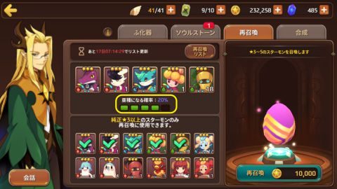 純正(初期状態、未昇級)で星3以上のスターモンを5体と10000ゴールドを使って、シーズンごとに決まった種類のスターモンを召喚することができます。