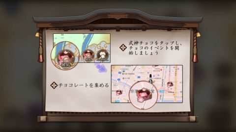 「陰陽寮」→「地図」を開き、チョコを集めましょう!