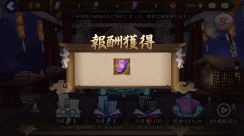 ▲召喚画面で「現世」をタップすると「現世霊符」がもらえます。