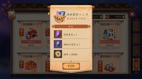 過去に販売された120円の「現世霊符パック」には「神秘の霊符」、「現世霊符」、30000×銭貨が含まれまており、お得なパックになっていました。