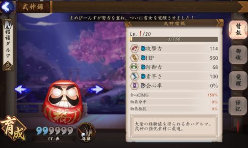 | 召喚・唐傘 | 1 | 妖力を持つ唐傘を召喚し、味方全体の被ダメージを20%ダウンさせる。クールダウン3ターン。 |