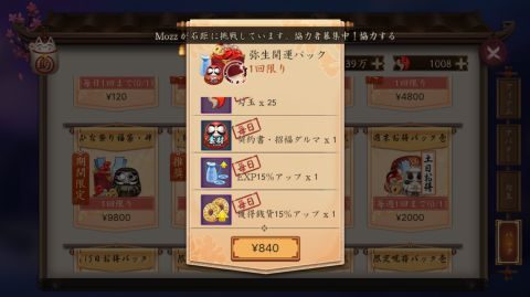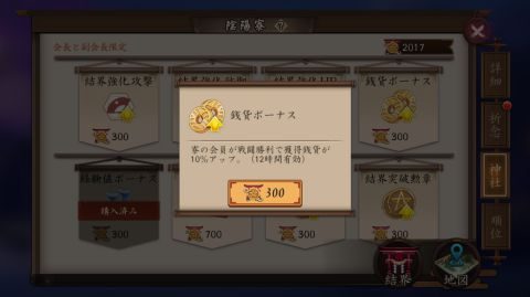 陰陽寮の神社で販売される「銭貨ボーナス」を購入すると、24時間、戦闘勝利で獲得できる銭貨が10%増えます。