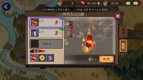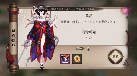 探索のクリア時に確率で妖怪(式神)を発見すると、挑戦から挑めるようになります。