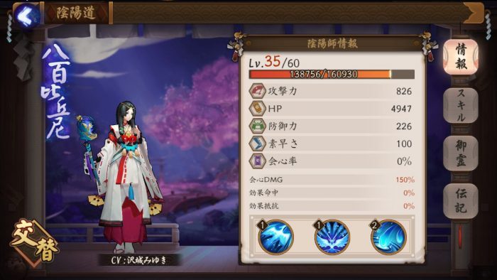 | 星の光 (基礎スキル) | 1 | 八百比丘尼が星の光を鳥の形に変えて敵単体に放つ。目標に攻撃力の100%相当のダメージを与える。 |