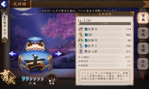 | 占いの印 | 1 | 八百比丘尼が占いの印で1ターンの間味方を守る。味方の1ターン後、守られている味方が失ったHPの15%を回復する。占いの印は重ねがけできない。クールダウンタイム2ターン。 |