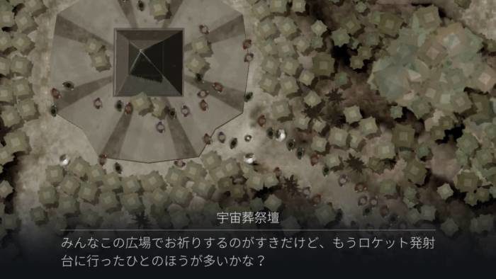 道なりにまっすぐ歩き、宇宙葬祭壇まで到着したら、右下の人込みの方に向かいます。