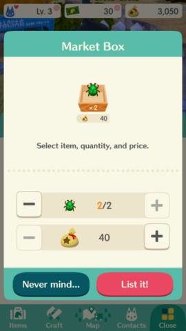 バザーでは他のプレイヤーと魚、フルーツ、ムシを売り買いすることができます。
