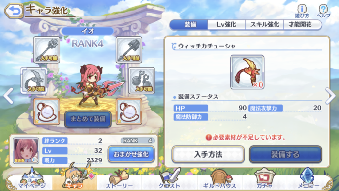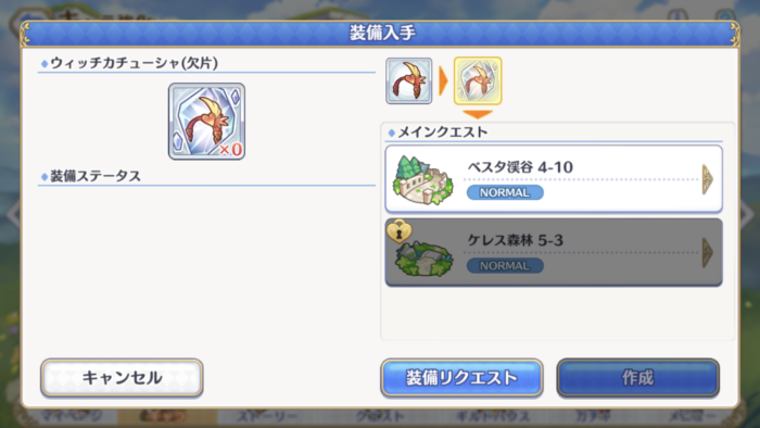 ランクアップに必要な装備を入手可能なクエストは、キャラ強化画面から欲しい装備をタップし、入手方法をタップするとその装備が手に入るクエストが一覧で表示され、クエストが解放されていれば直接そのクエストにジャンプすることができます。
