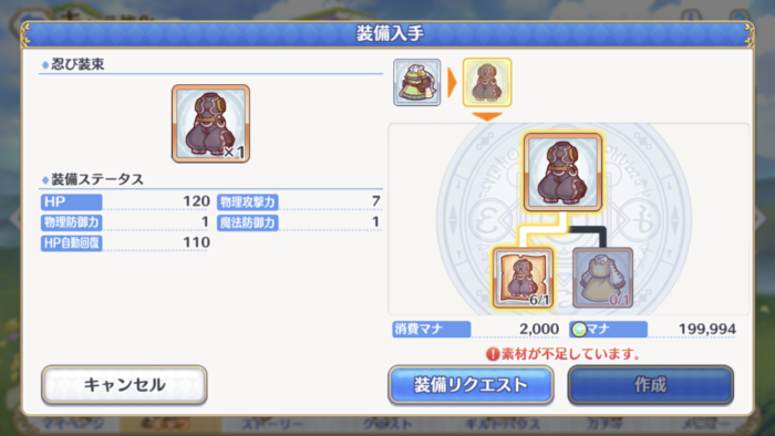 装備を作るのに複数の装備や素材が必要な場合があり、その場合はグレーになっている装備をタップすると足りない装備にたどり着きます。
