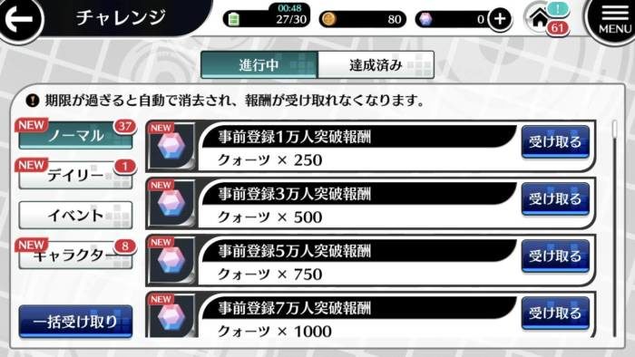 チュートリアルが終わり自由に動けるようになったら、チャレンジのノーマルから事前登録報酬などのクォーツを回収します。この時点でノーマル以外にクォーツはないので、スルーでOKです。
